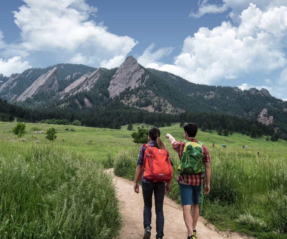 Hikers living in Boulder, CO, walk along a trail at Chautauqua Park, surrounded by shrubs and open green fields, with forested mountains stretching across the background on a clear, sunny day with scattered clouds.