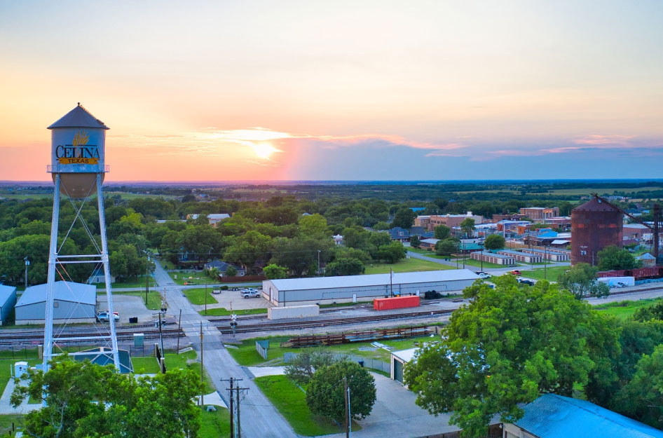 Sunset view of a water tower surrounded by Celina, TX, neighborhoods — featuring lush greenery and both residential and commercial buildings.